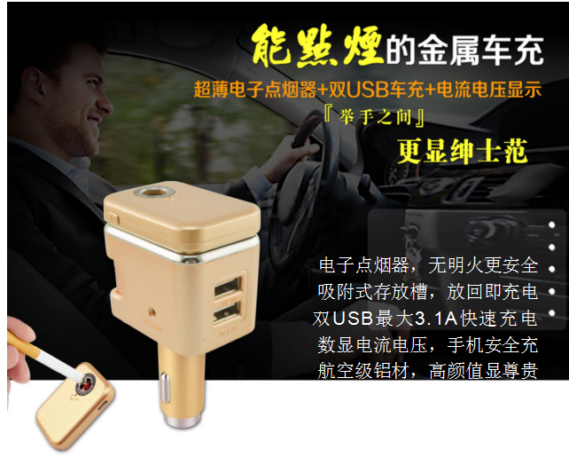 超薄電子點煙器+雙USB車充+電流電壓顯示>