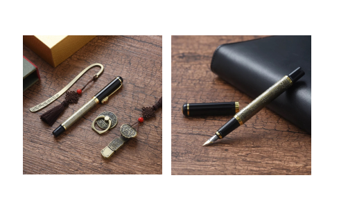 筆身采用古銅,立體浮雕甲骨文,龍頭造型,點睛之筆;筆尖由純不銹鋼制成,書寫圓滑有彈性,流暢;