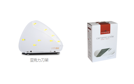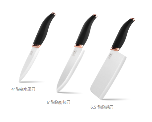 【產品尺寸】 23.2×33×12 cm 【裝箱數量】 6 pcs/ctn 【產品材料】 氧化鋯+TPR+ABS手柄 產品描述: 6.5"陶瓷菜刀、6"陶瓷廚 師白刀、4"陶瓷水果白刀、亞克力刀 架、彩盒包裝。
