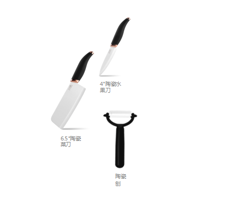 【產品尺寸】 31.5×19×3 cm 【裝箱數量】 20 pcs/ctn 【產品材料】 氧化鋯+TPR+ABS手柄 產品描述: 6.5"陶瓷菜刀、4"陶瓷 水(shui)果刀(dao)、陶瓷刨、彩盒包裝。
