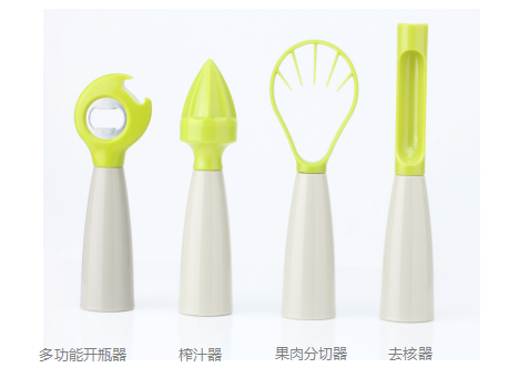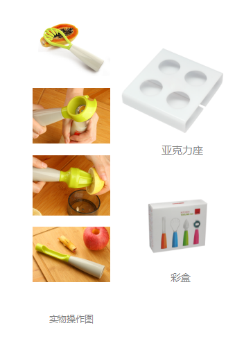 【產品尺寸】 29×8×24CM 【裝箱數量】 10 pcs/ctn 【產品材料】 PS+不銹鋼 +PP 產品描述: 去核器、果肉分切器、 榨汁器、多功能開瓶器、亞克力座、 彩盒包裝。