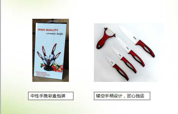 【材質】高級氧化鋯 【大小】6寸廚師刀,5寸切肉刀,4寸萬用刀, 3寸水果刀,陶瓷瓜刨,亞克力刀架 【適用范圍】各種蔬果及無骨肉類 【產品規格】彩盒,31.5*18*12cm 【裝(zhuang)箱率】62*39*35cm/10套(tao)