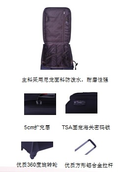 拉桿箱,可托運。主料采用尼龍面(mian)料防潑水,耐磨(mo)性(xing)強。優質的360度旋轉輪(lun),可側拉、平推,大(da)大(da)減輕了您手臂的壓力(li)。優質的鋁合(he)金(jin)拉桿,本布手把設計(ji)新穎。自帶TSA固定海(hai)關密(mi)碼鎖,使用便捷。前幅設計(ji)新穎時(shi)尚,并配有拉鏈物件袋,可(ke)放置隨(sui)身物品。箱體(ti)有5cm的(de)(de)擴(kuo)充層,內部空間大(da),放置更多物品。是(shi)您出差(cha)旅行的(de)(de)好“伴侶”。